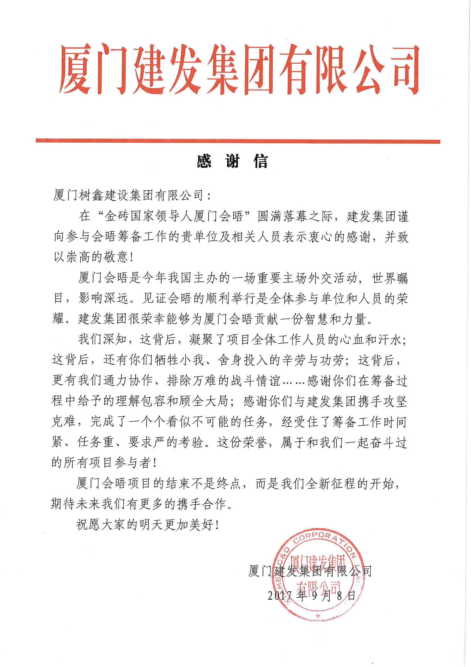 金磚建發(fā)集團(tuán)感謝信